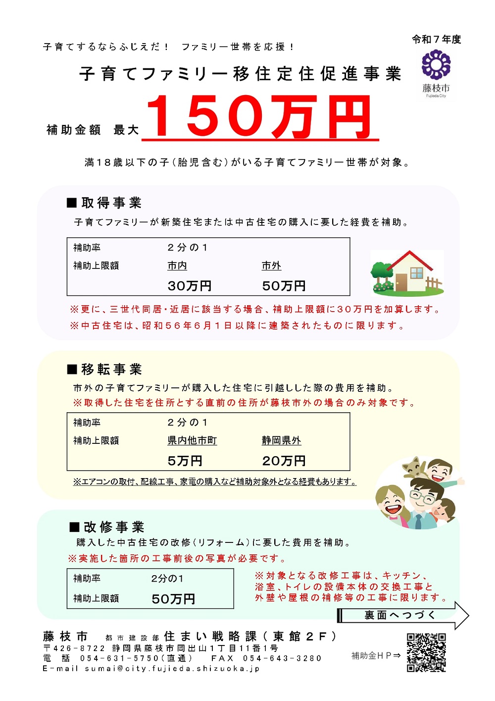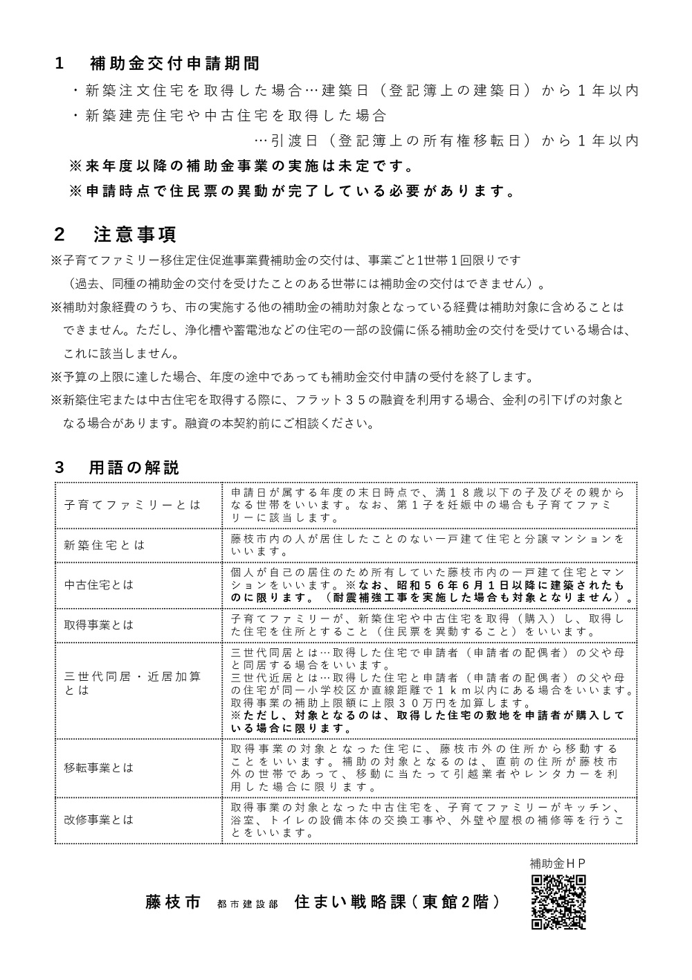 子育てファミリー世帯が、藤枝市内で新築住宅または中古住宅を購入に要した経費を補助。