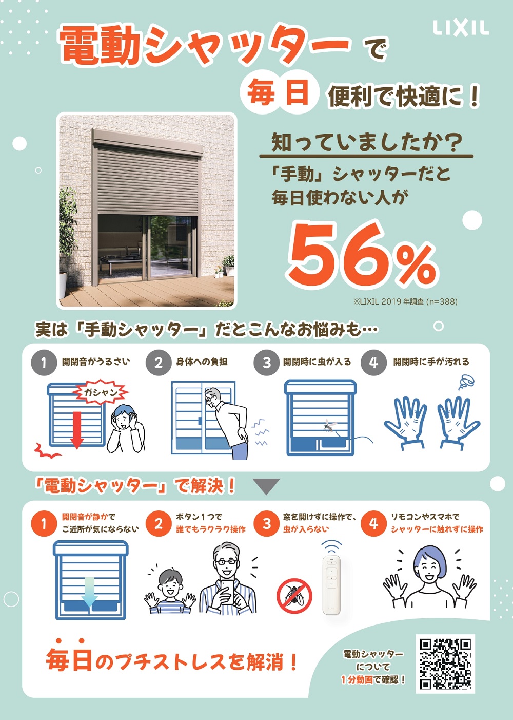 大きな窓のシャッター、開閉が多い場所も、ボタン1つでラクラク開閉が可能です。