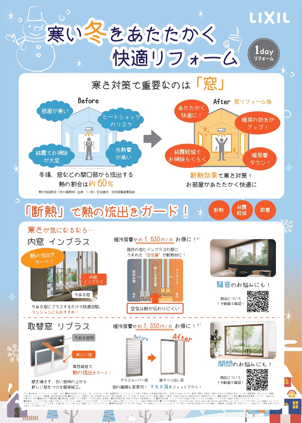 「内窓インプラス」「取替窓リプラス」の断熱対策で熱の流出をガード!