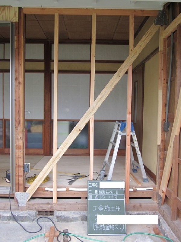 まずは壁の一部を解体し、「筋かい」という部材の新設・補強をします。 |